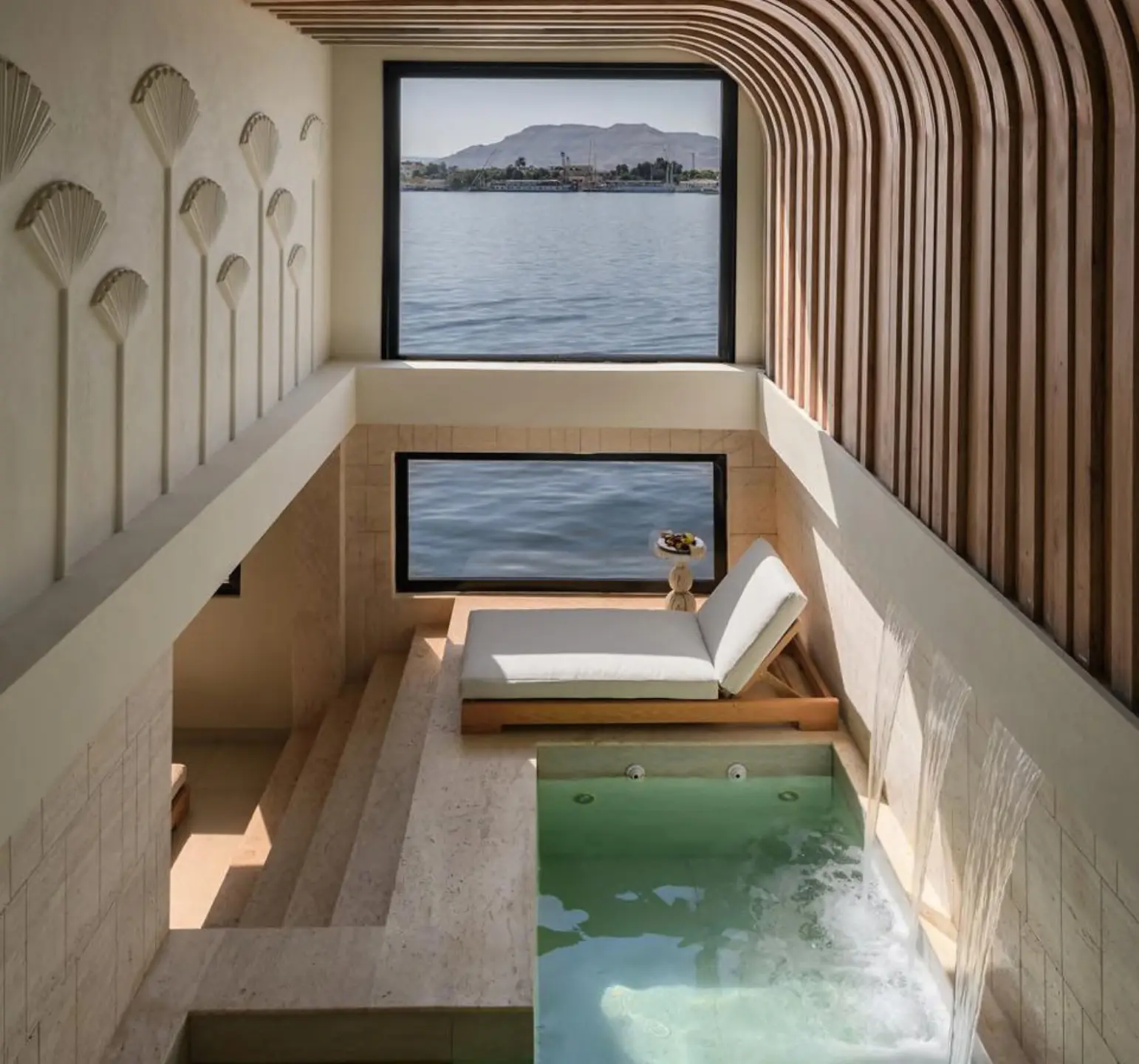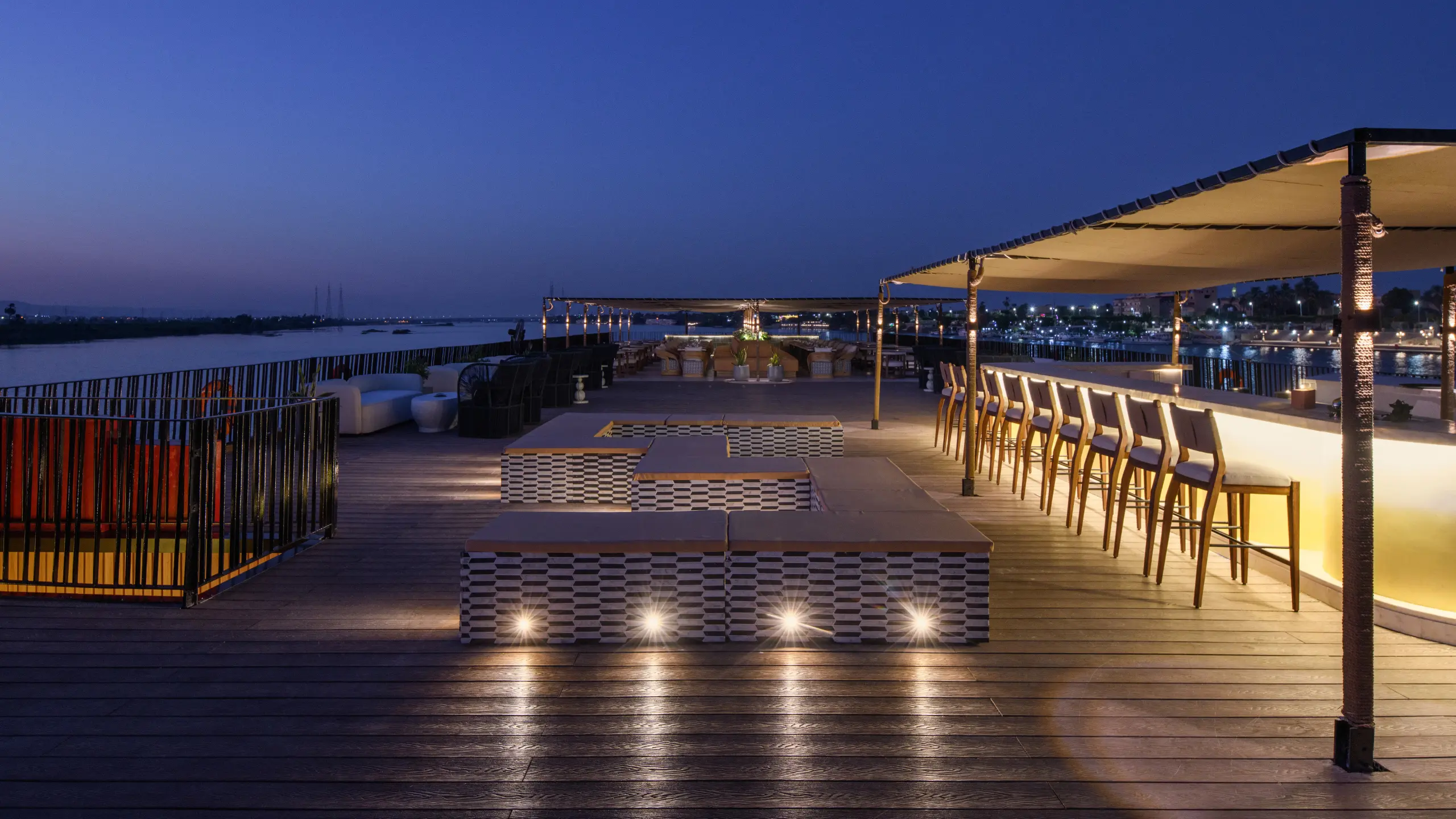Restaurante com sabores autênticos egípcios, lounge bar 24h, spa completo com jacuzzi e vista para o Nilo, além de piscina, academia e sundeck para aproveitar cada momento a bordo.